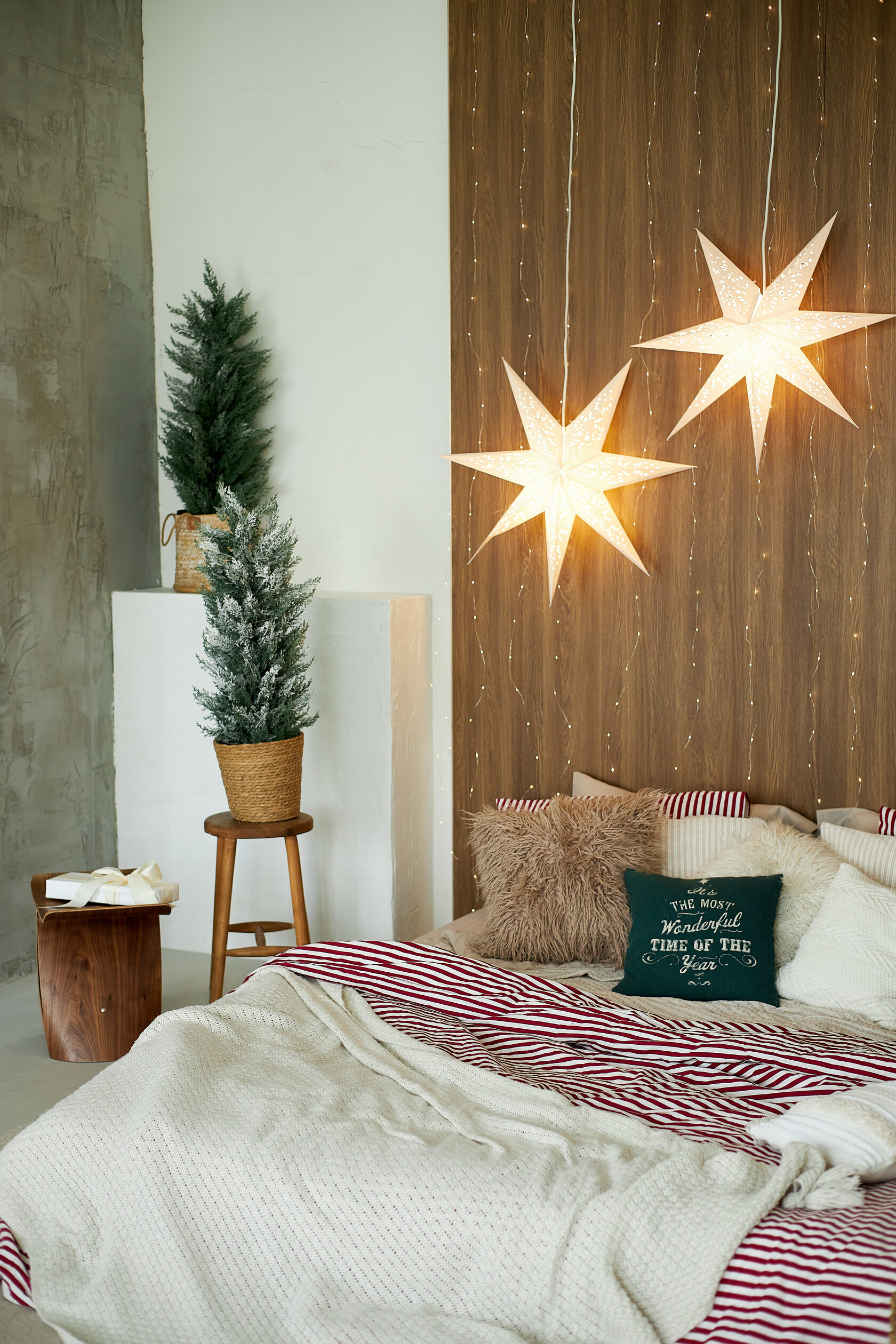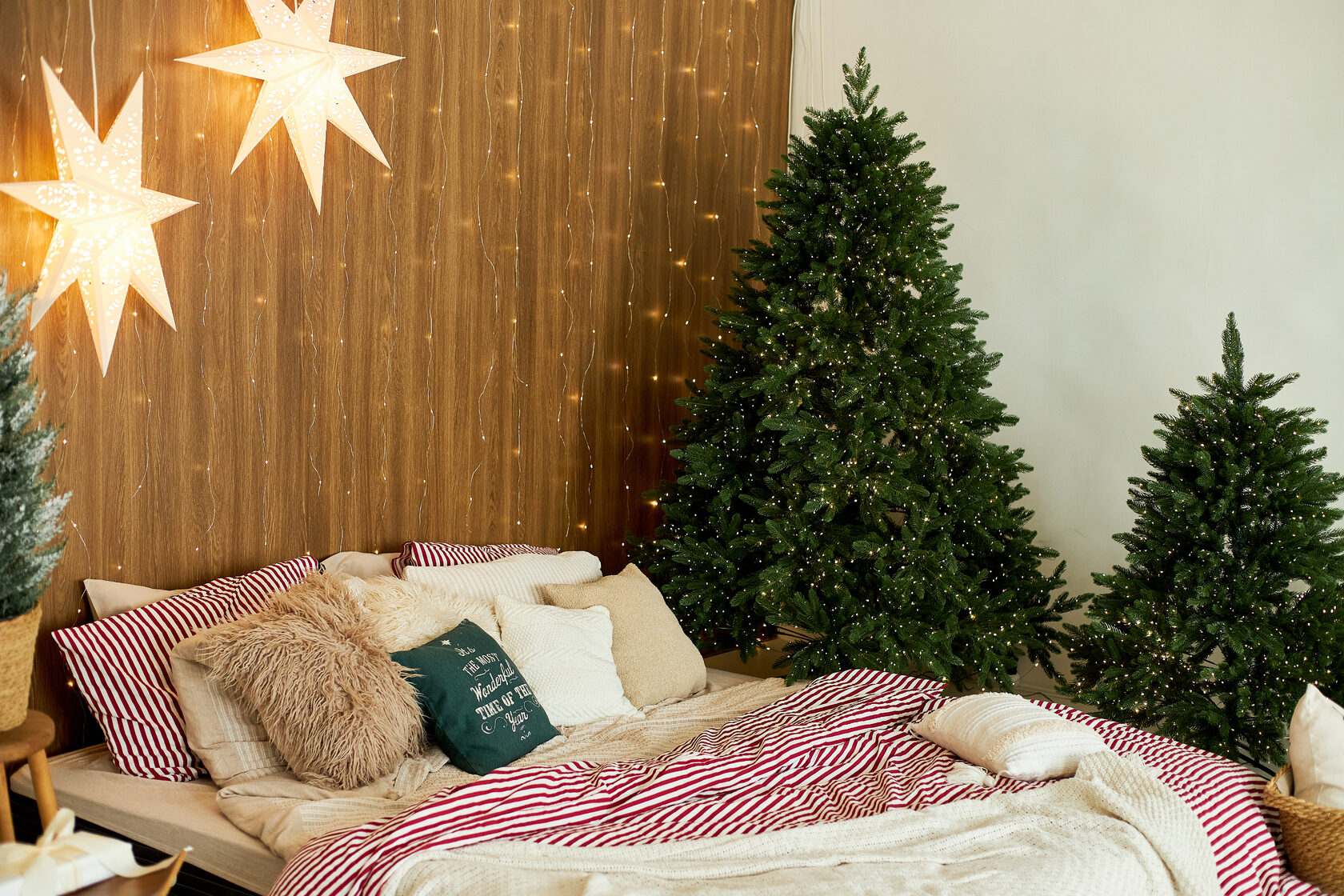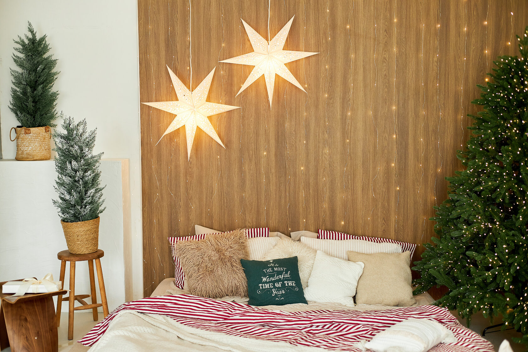 Мягкий свет звёзд, тёплая деревянная стена, мерцающие гирлянды и пушистые ёлки создают атмосферу домашнего праздника.